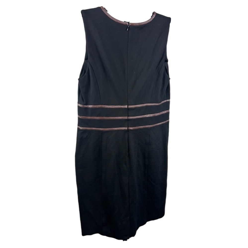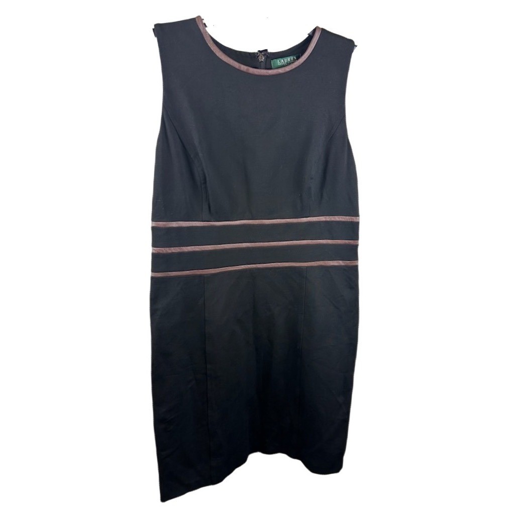 Keywords: Lauren Ralph Lauren, black dress, sleeveless dress, leather trim, sheath dress, knee length dress, career dress, work dress, formal dress, size 14, classic dress, business casual, interview dress, office attire
