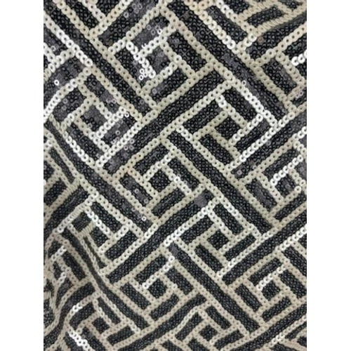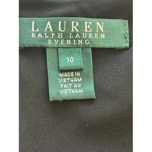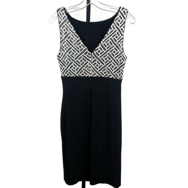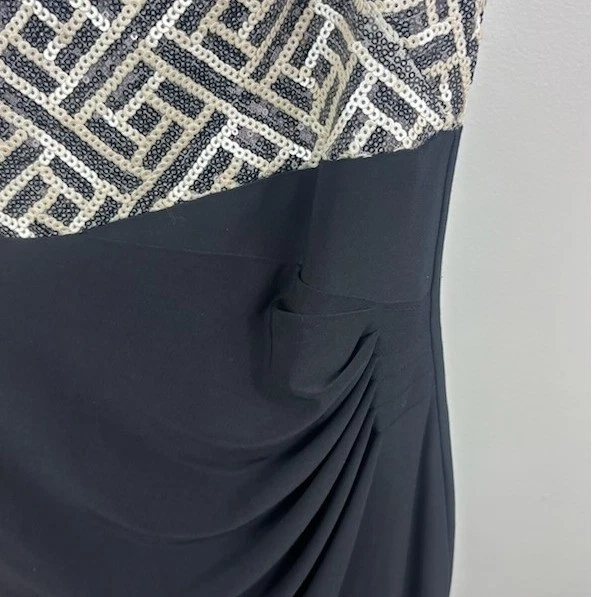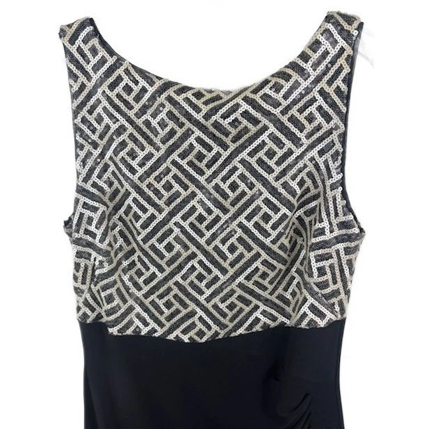 This Ralph Lauren dress is 38 inches in length and 20 inches pit to pit laid flat. A stunning cocktail dress blending geometric sequin embellishments with a sleek black silhouette. The sleeveless design features a dazzling sequin bodice in a striking geometric pattern, transitioning into a flattering ruched skirt that creates an elegant drape. This dress is perfect for a semi-formal event, a wedding guest outfit, or a stylish night out.