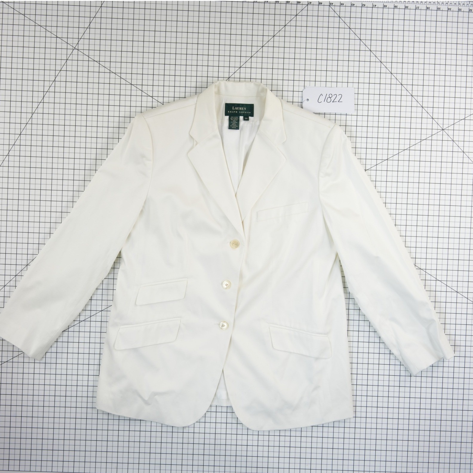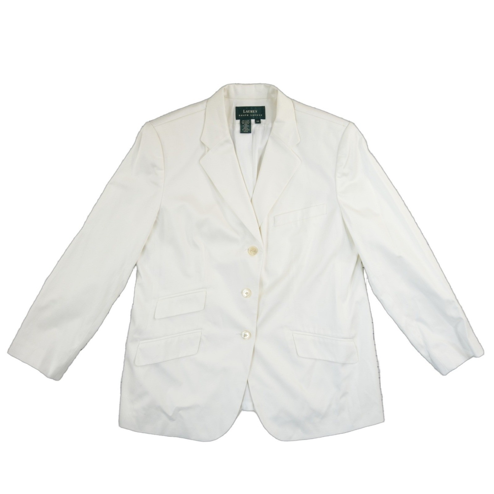 Excellent Condition! Lauren Ralph Lauren blazer crafted from a crisp cotton blend with a hint of stretch for a comfortable, tailored fit. This sophisticated jacket features a classic three-button front closure, notched lapels, and unique double-flap pocket detailing on one side for a modern twist on traditional equestrian styling. Fully lined for a smooth drape, it offers a polished look suitable for professional settings or elevated casual wear.
