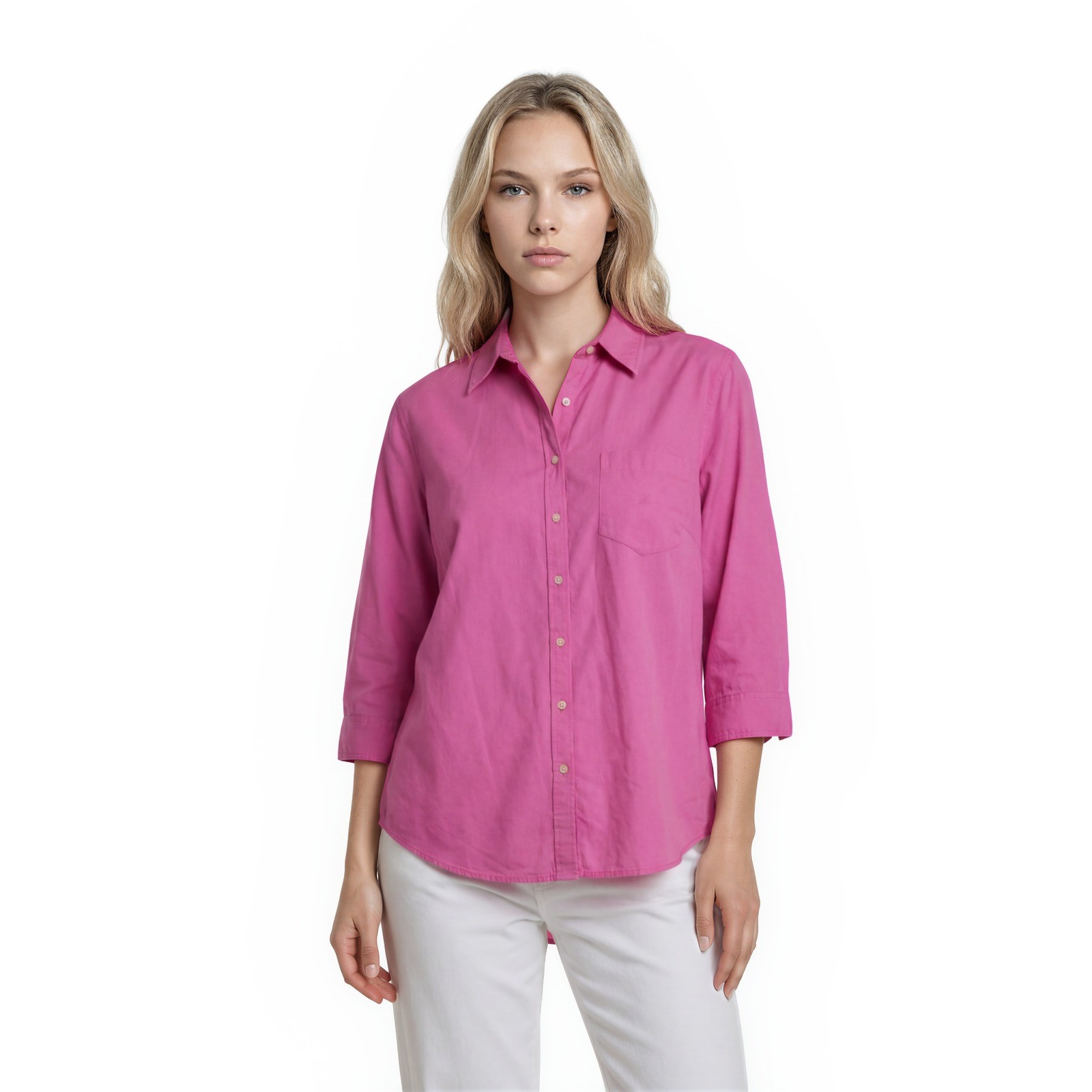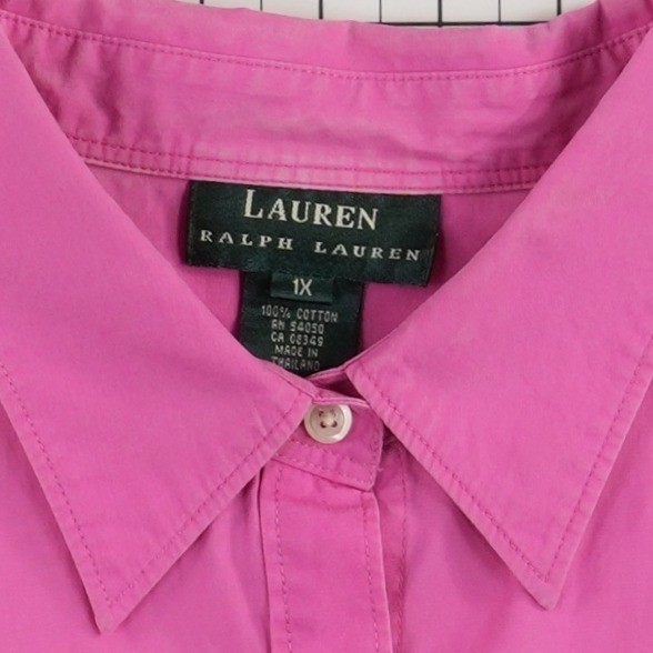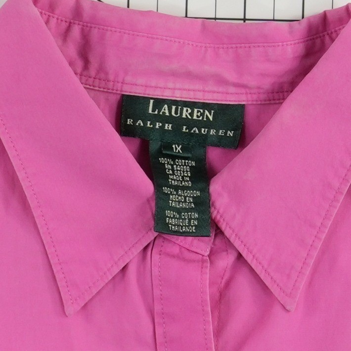 Excellent Condition! Lauren Ralph Lauren button-down shirt crafted from breathable 100% cotton in a vibrant pink hue. This versatile piece features a classic pointed collar, a single chest pocket with subtle logo embroidery, and 3/4 length sleeves for a polished yet relaxed look. The curved hem and buttoned front offer a timeless silhouette suitable for professional settings or casual weekend wear.