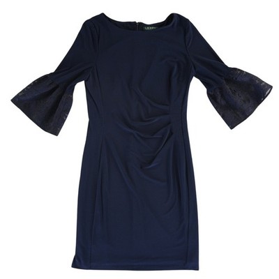 Lauren Ralph Lauren sheath dress in a deep navy blue features elegant lace bell sleeves and a sophisticated side-ruched detail that creates a flattering silhouette. The boat neckline and concealed back zipper provide a polished finish, while the jersey-like fabric offers a comfortable stretch. Perfect for cocktail parties, weddings, or professional evening events, this piece combines classic tailoring with modern feminine accents.