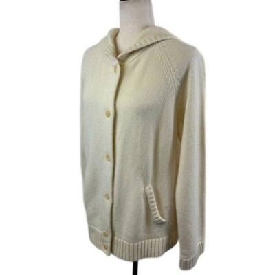 A cream knit button-up hoodie cardigan sweater from Lauren Ralph Lauren. This comfortable and stylish piece features a classic button-front closure, a cozy hood, and convenient front pockets. The ribbed cuffs and hem add a touch of classic detail. Perfect for casual outings, lounging at home, or layering on a cool evening.