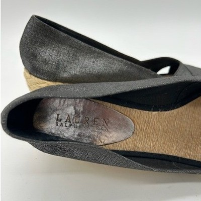 Excellent condition! Lauren Ralph Lauren Cecilia espadrille wedge shoes in dark gray. These stylish peep-toe wedges feature a crisscross linen upper and a classic espadrille jute wrapped wedge heel. Perfect for a casual day out, a summer vacation, or a relaxed evening gathering.