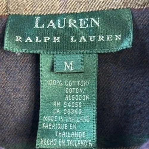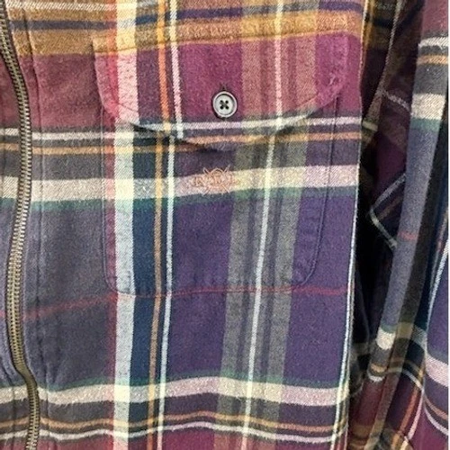 This Lauren Ralph Lauren zip-front flannel shirt/jacket. It measures 27 inches in length, has a sleeve length of 21 inches, and is 23 inches pit-to-pit when laid flat. This long-sleeve piece features a full-length zipper closure, a pointed collar, and two button-flap chest pockets for a utilitarian touch. The rich palette of purple, burgundy, and gold tones creates a warm, autumnal aesthetic perfect for transitional weather. Finished with adjustable button cuffs and a straight hem, it balances the comfort of a traditional flannel with the functionality of a light jacket.