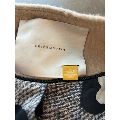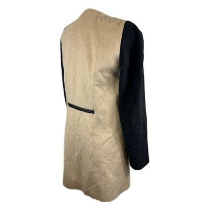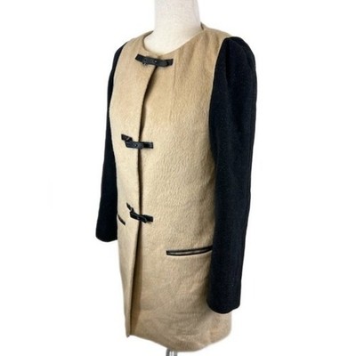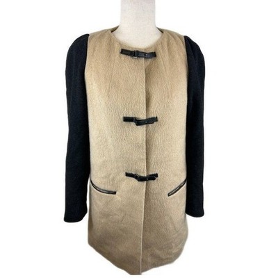 Keywords: Leifsdottir coat, wool blend coat, black sleeve coat, toggle closure coat, color block outerwear, size 4 coat, womens coat, beige and black coat, collarless coat, dress coat, casual coat, stylish outerwear, designer coat, winter coat