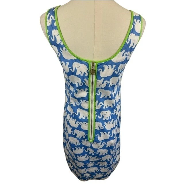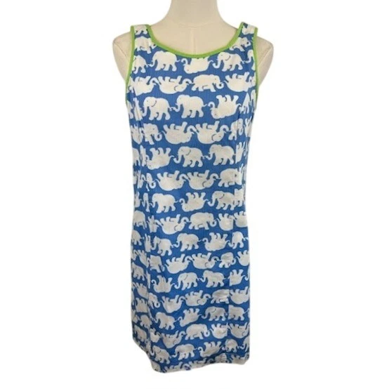 A playful statement piece, this Lilly Pulitzer dress features a delightful elephant print in a vibrant blue and white palette. The sleeveless design and shift silhouette offer a comfortable and flattering fit, while the bright green trim adds a pop of color and a touch of whimsy. The full zipper in the back ensures easy wear. Perfect for a sunny brunch, a casual garden party, or a day of exploring a new city, this dress is sure to turn heads and spark conversation.