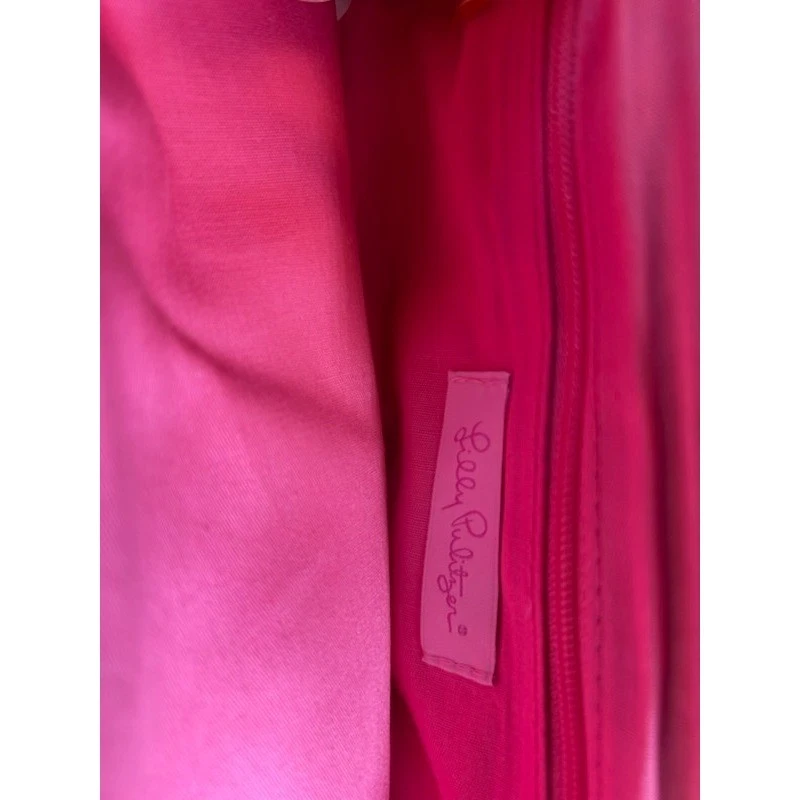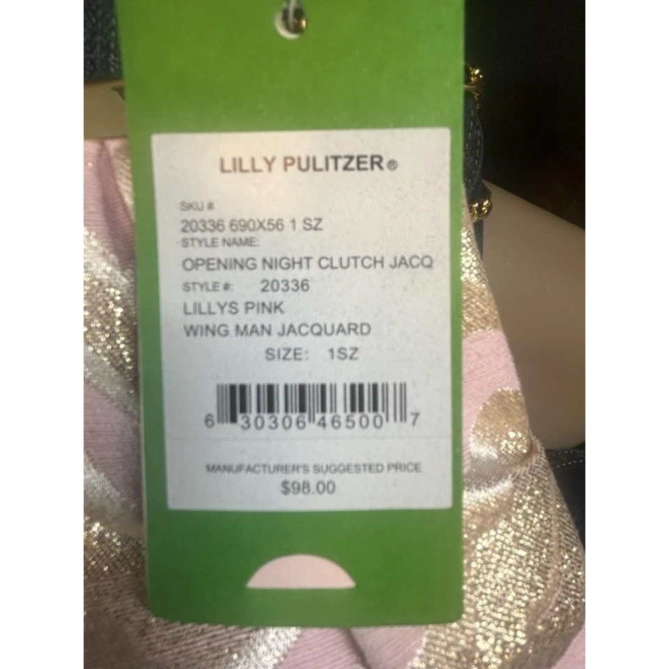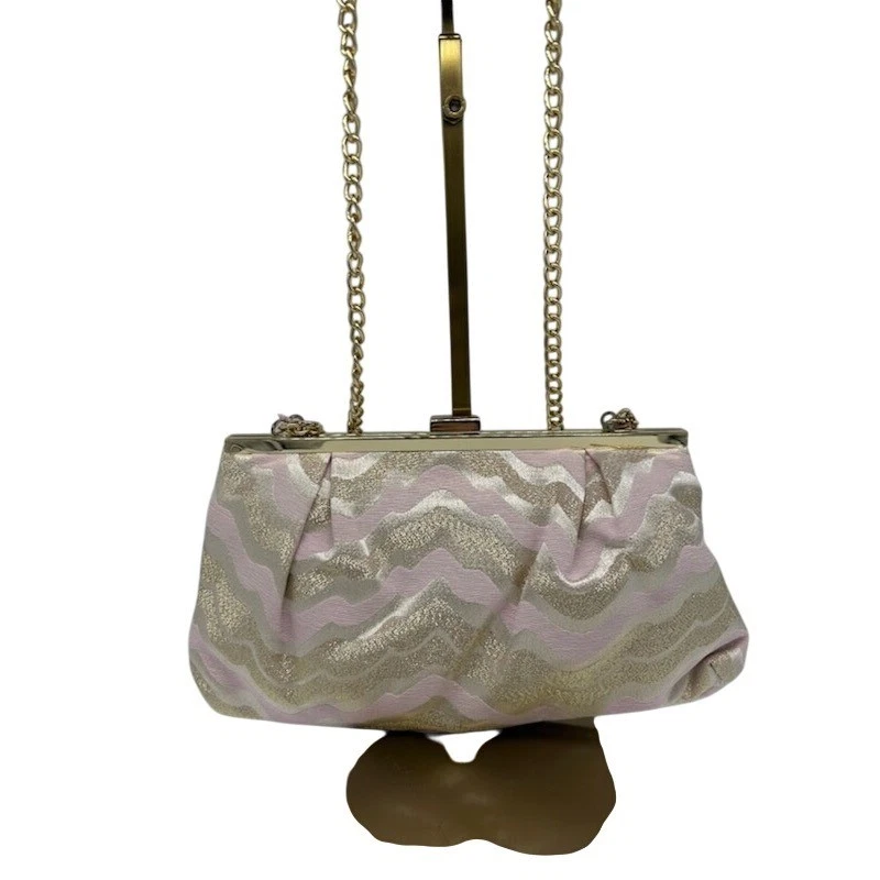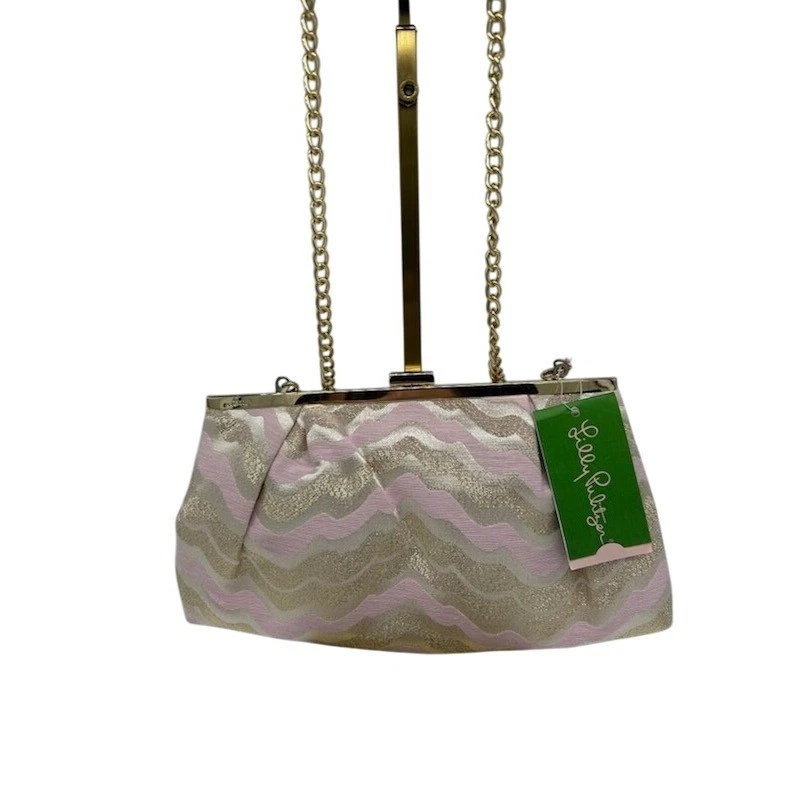 Elevate your evening ensemble with this Lilly Pulitzer clutch, a statement piece that exudes sophistication and charm. Imagine the soft, luxurious feel of the jacquard fabric as you hold it, the subtle shimmer of gold catching the light with every movement. The delicate pink and gold chevron pattern adds a touch of whimsy, while the elegant chain strap allows for effortless carrying. The perfect accessory for a cocktail party, a romantic dinner, or a special occasion where you want to make a lasting impression.