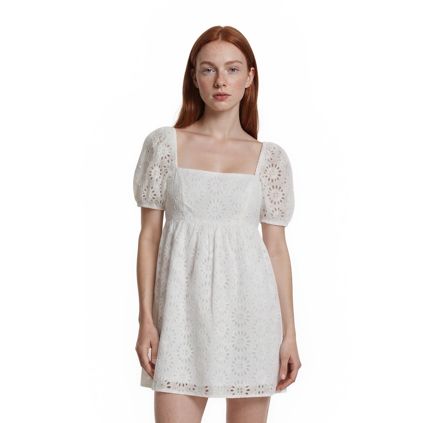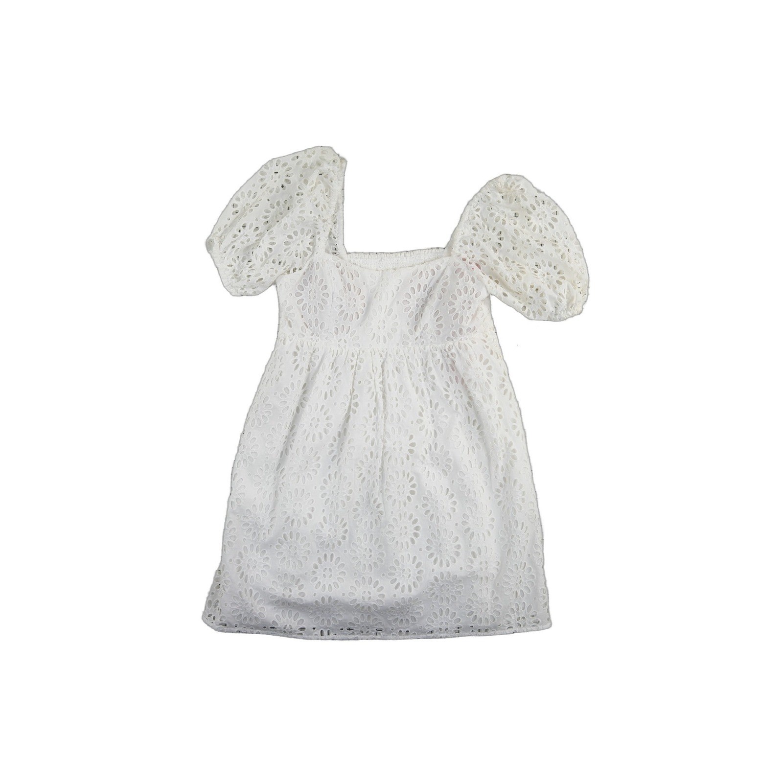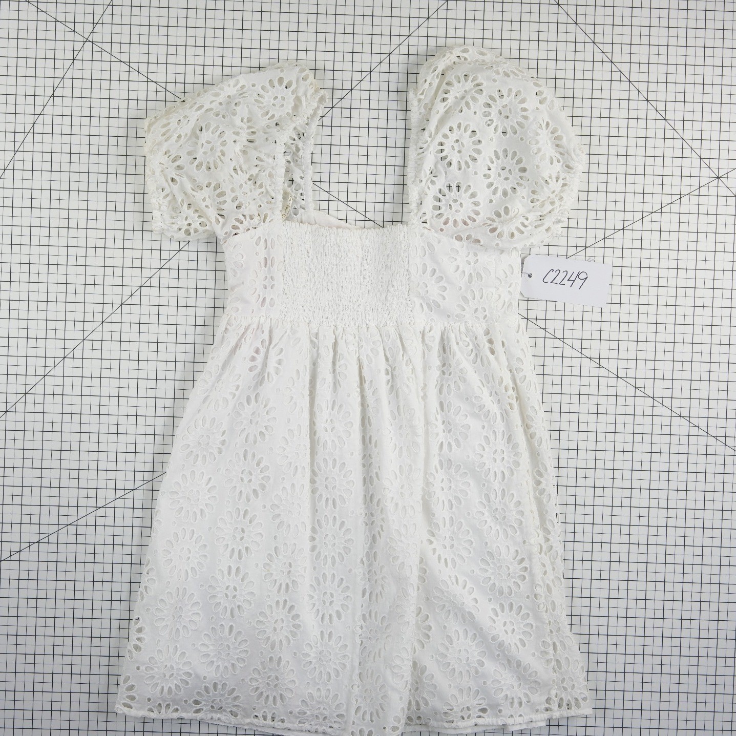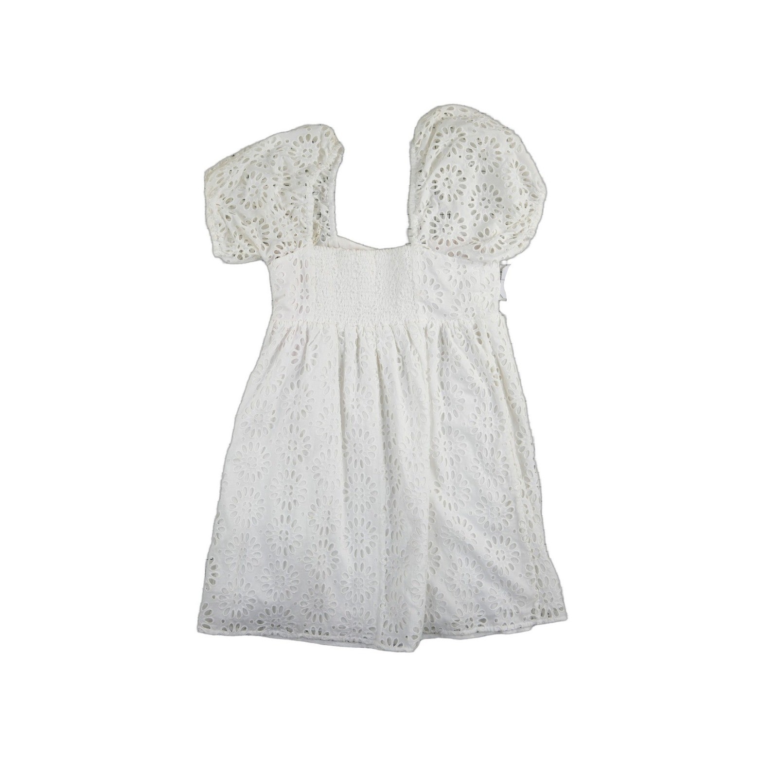 Excellent Condition, looks like new! White eyelet cotton dress showcases intricate floral embroidery and a classic babydoll silhouette. Designed with voluminous puff sleeves and a square neckline, it features a smocked back panel for a comfortable, tailored fit. The lightweight, breathable fabric is fully lined, making it an ideal choice for garden parties, summer outings, or bridal events.