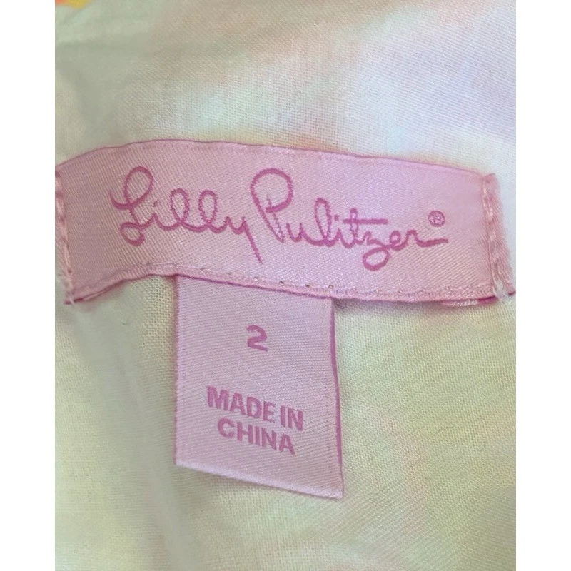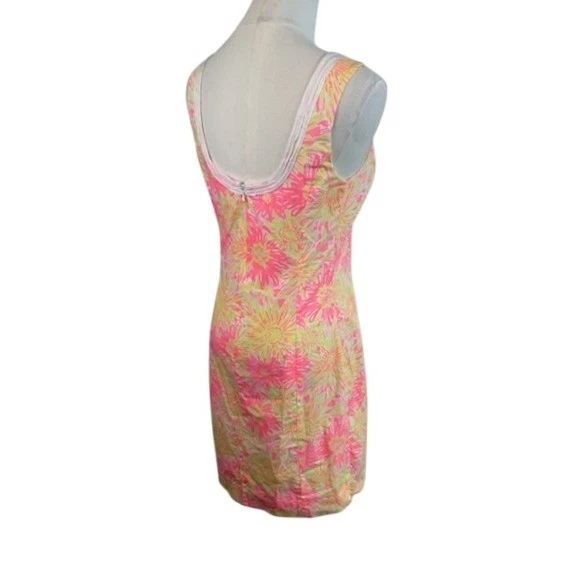 Radiant charm blooms in this Lilly Pulitzer dress, a vibrant statement piece that captures the essence of sunny days and effortless style. The eye-catching pink and yellow floral print dances across the fabric, creating a lively and joyful visual experience. Intricate white embellishments trace the neckline, adding a touch of refined elegance and drawing attention to the flattering V-neck design. This dress is perfect for a garden party, a brunch date with friends, or a casual yet chic vacation ensemble.