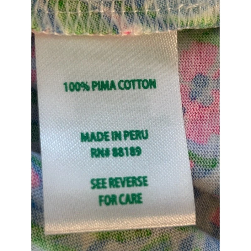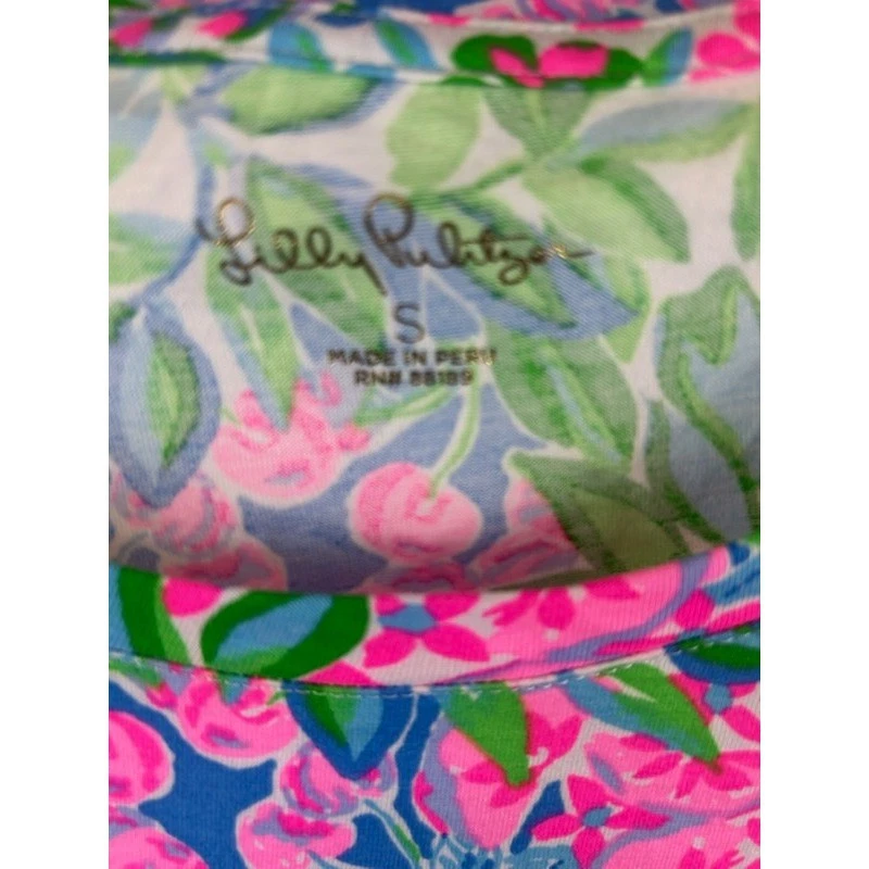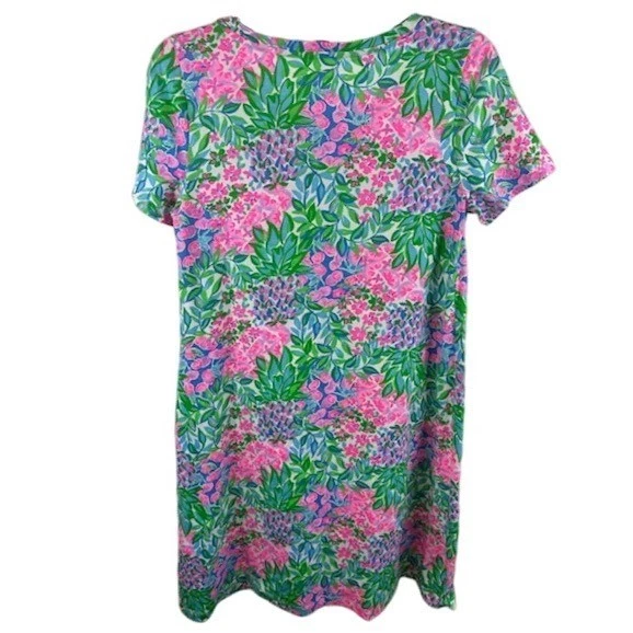 Eye-catching shift dress in a vibrant floral print. The design features a colorful array of pink flowers and green leaves, accented with hints of blue and purple, creating a visually appealing and cheerful pattern. Made from a soft and comfortable fabric, this dress offers a relaxed fit and a classic crew neckline. Perfect for casual outings, brunch with friends, or a sunny day at the park, this Lilly Pulitzer dress brings a touch of playful elegance to any occasion.