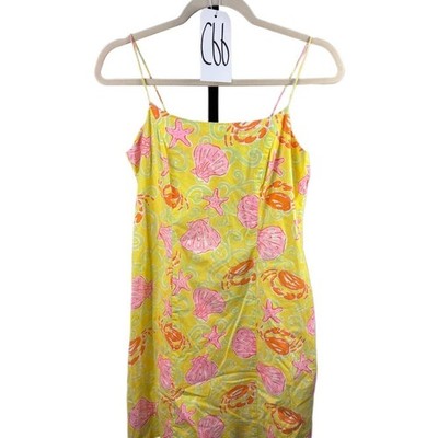 This Lilly Pulitzer mini dress measures 29 inches in length and is 18 inches pit to pit laid flat. Showcasing a vibrant yellow base adorned with a playful print of pink seashells orange crabs and starfish. This sleeveless dress features a flattering silhouette and delicate spaghetti straps perfect for a beach vacation or a summer brunch.