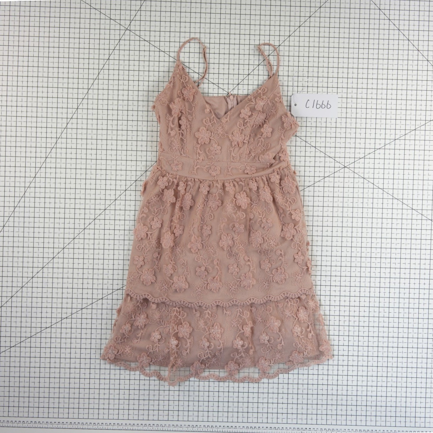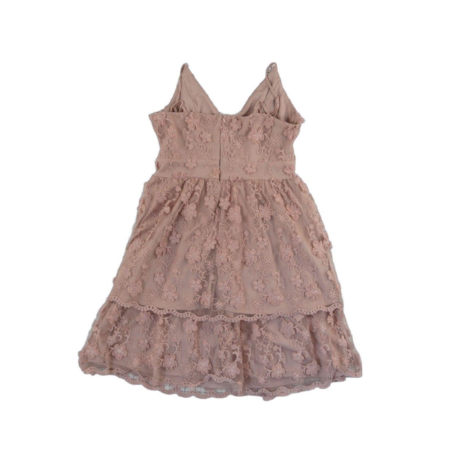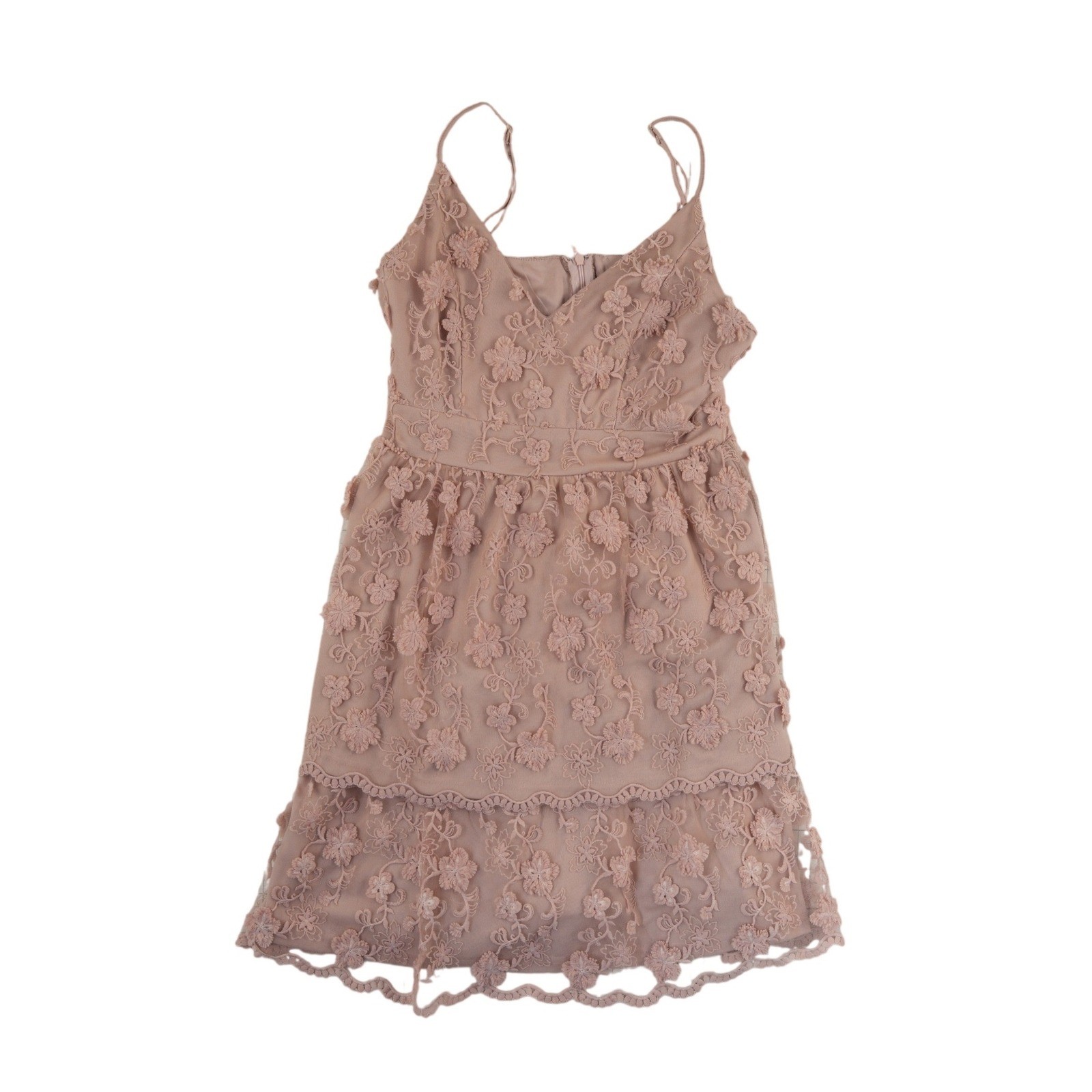 Excellent Condition! Intricate floral lace overlays this charming mini dress, creating a romantic and feminine silhouette. The V-neckline leads to adjustable spaghetti straps for a personalized fit, while the scalloped hem and tiered skirt add playful movement. A concealed back zipper ensures a smooth finish, making this dusty rose piece an ideal choice for garden parties, weddings, or summer evenings.