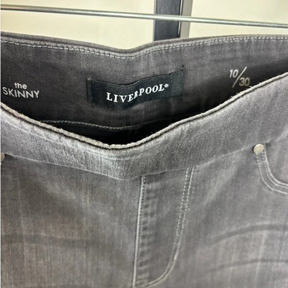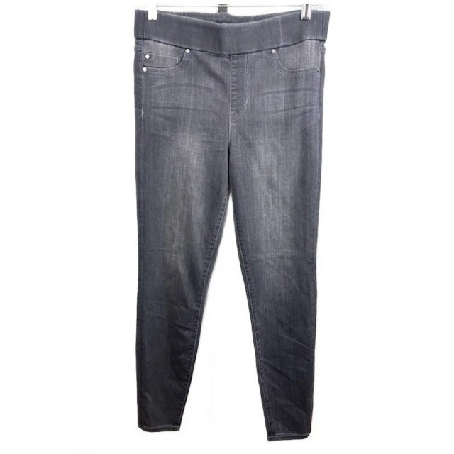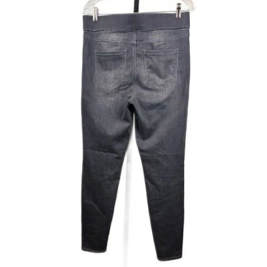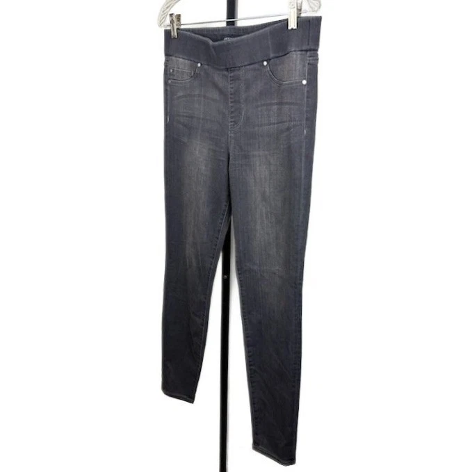 This full length Dark wash denim jeans in a skinny fit with an elastic waistband. These comfortable and stylish jeans offer a flattering silhouette with a pull-on design. Featuring classic five-pocket styling, they present a versatile option for everyday wear. Perfect for a casual brunch, running errands, or a relaxed evening out.