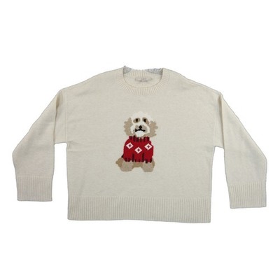 LOFT Intarsia Dog Sweater in a soft cream knit features a charming graphic of a dog wearing a red fair isle sweater. Crafted with a comfortable cotton-blend yarn, this long-sleeve pullover offers a relaxed fit with dropped shoulders and ribbed trim at the crew neckline, cuffs, and wide hem. Perfect for animal lovers looking for a cozy, whimsical addition to their casual wardrobe.