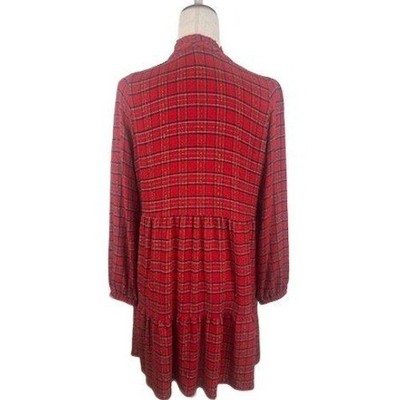 LOFT Red Gold Plaid Tiered Dress Ruffle Neck Long Sleeve Tartan Size Small