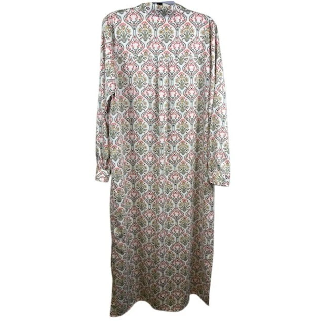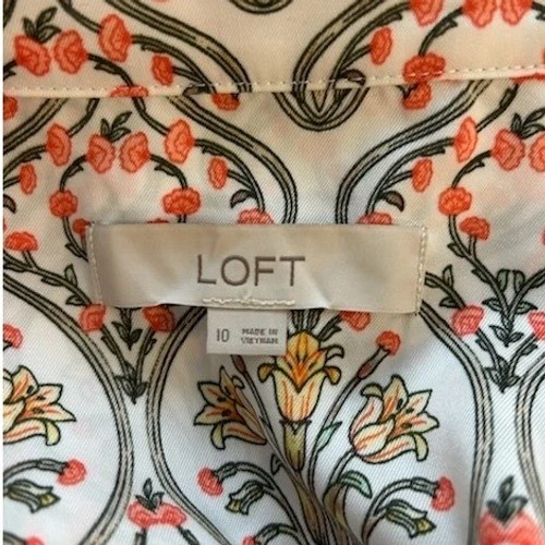 A women’s maxi shirt dress by LOFT featuring a captivating all-over floral print. This elegant dress showcases a classic collared neckline and long sleeves with button cuffs, offering a versatile silhouette. The full button-front closure allows for adjustable styling options. Perfect for a garden party or a stylish brunch.