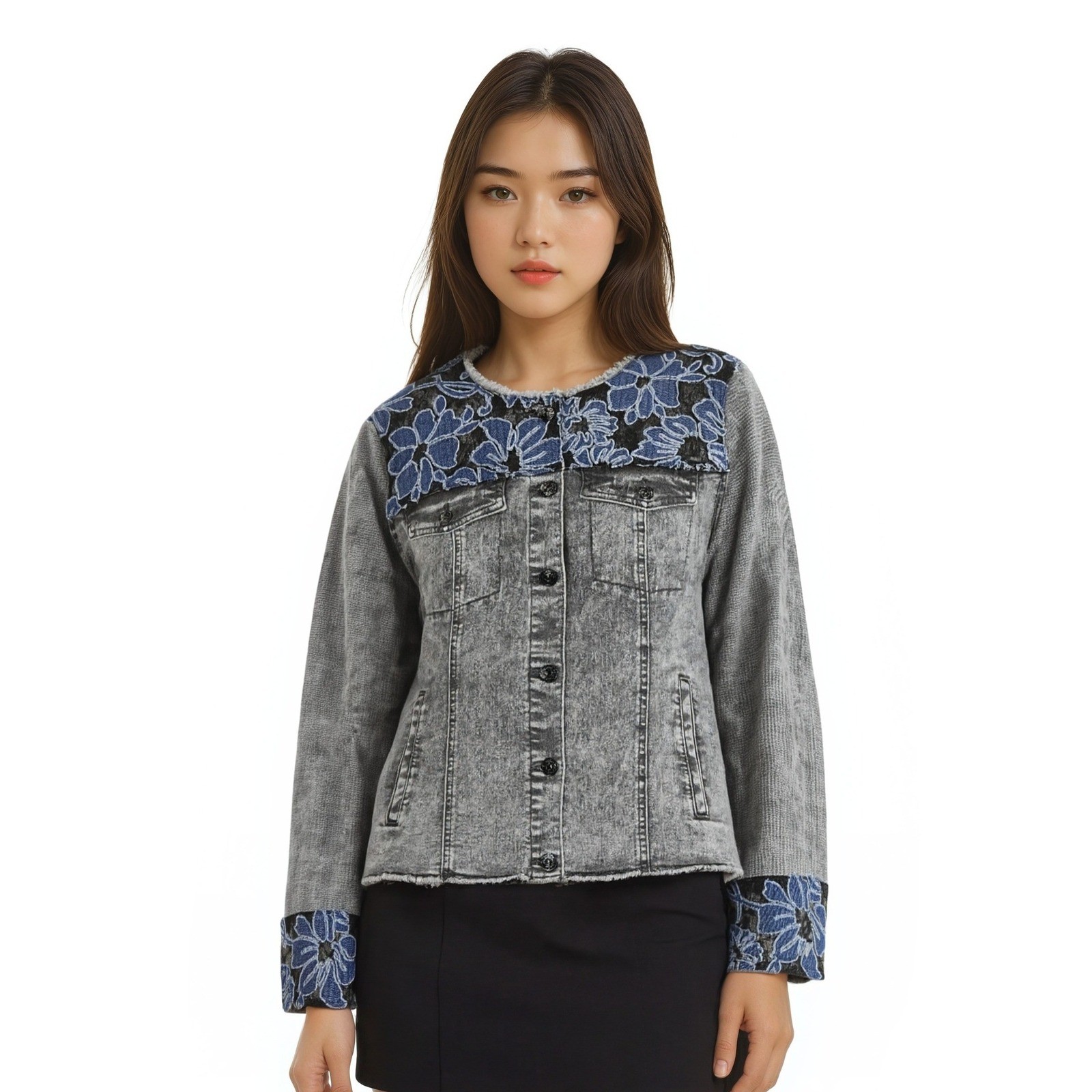 Excellent Condition, looks like new! LOGO by Lori Goldstein denim jacket in a washed gray finish features intricate blue floral lace overlays at the yoke and cuffs. This button-front piece is designed with a raw-edge collar and hem for a contemporary, distressed look, complemented by classic chest flap pockets and side welt pockets. The blend of rugged denim with delicate embroidery creates a unique textural contrast, perfect for layering over casual or dressy ensembles.