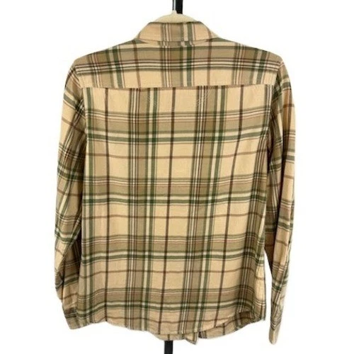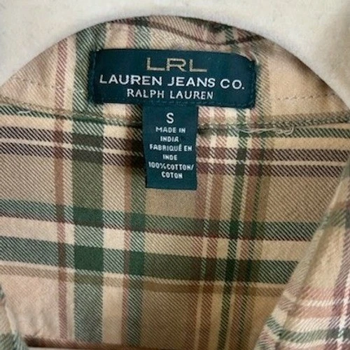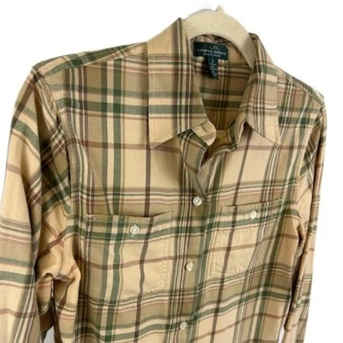 Excellent condition! A classic LRL Ralph Lauren Jeans Co plaid flannel button-down shirt. This shirt features a timeless plaid pattern in shades of beige green and brown. It includes two chest pockets with button closures and a standard collar. Crafted from comfortable material ideal for layering. Perfect for casual outings weekend adventures or layering for a cozy fall look.