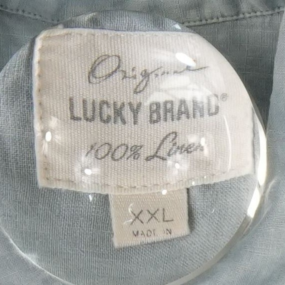 Excellent Condition! Lucky Brand short sleeve button down shirt crafted from breathable 100% linen in a versatile light blue shade. This casual top features a classic pointed collar, a single chest pocket with subtle stitch detailing, and a curved hem for a relaxed look. The lightweight, textured fabric makes it an ideal choice for warm weather styling, whether worn solo or layered over a tee.