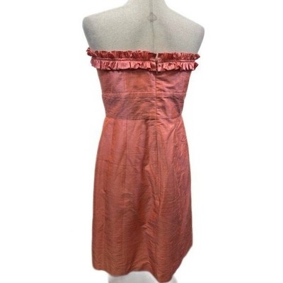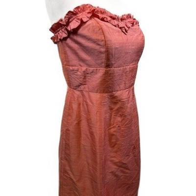 A coral pink strapless lined dress by Lula Kate measures approximately 28 inches. This charming dress features a ruffled sweetheart neckline and a defined waistband that flares out into a knee-length skirt. The textured silk blend fabric gives it a subtle sheen and elegant drape, perfect for a sophisticated cocktail party or a romantic dinner date.