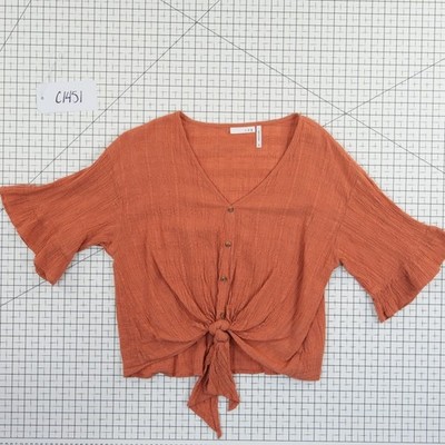Excellent Condition! Lightweight cotton gauze top features a breezy, textured fabric perfect for warm weather. Designed with a deep V-neckline and a functional button-front closure, it transitions into a charming tie-front hem that creates a cropped, flattering silhouette. The wide, fluttery short sleeves add a touch of feminine movement, making it an ideal choice for casual outings or beachside layering.