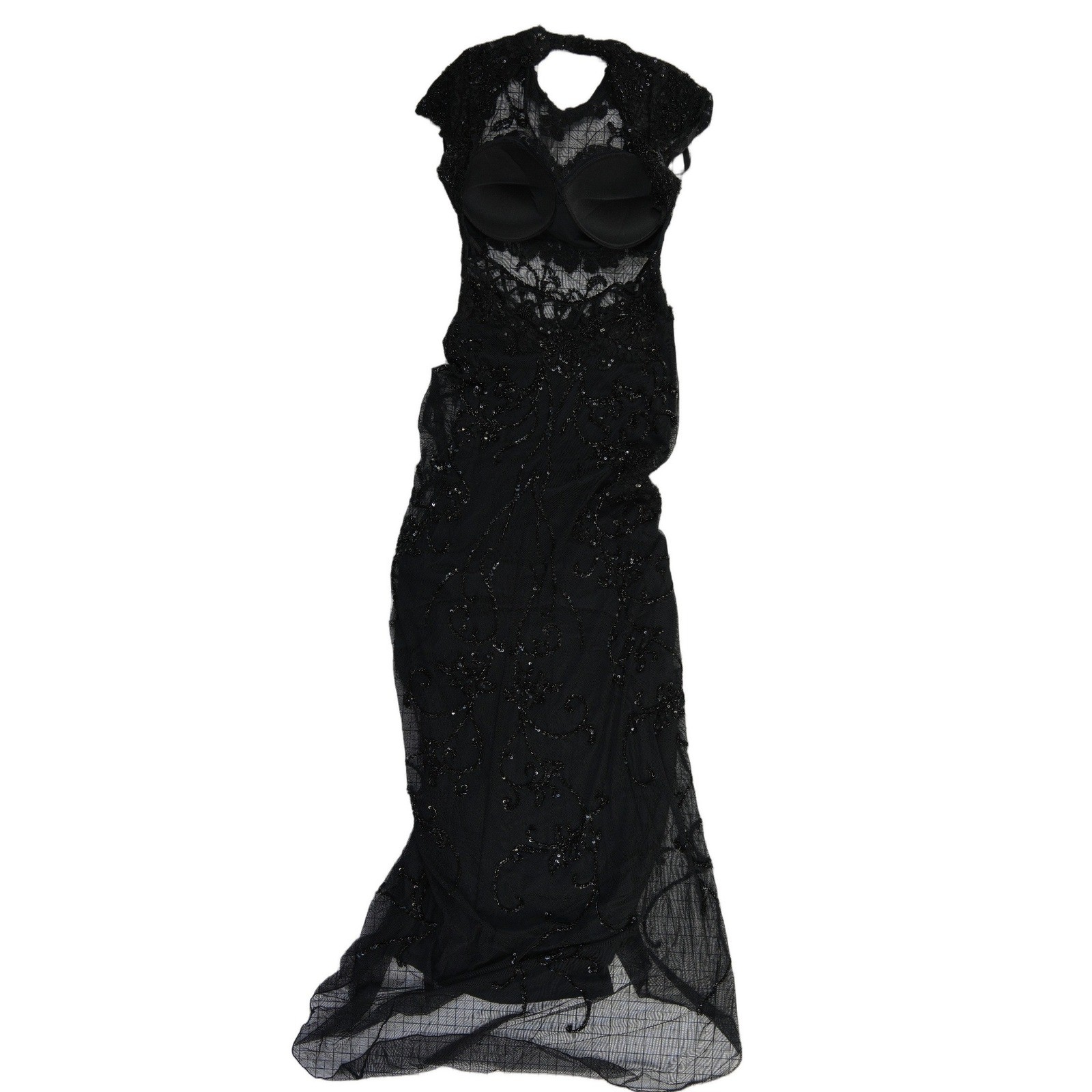 Excellent Condition! Mac Duggal evening gown showcases intricate black beadwork and sequins over a delicate mesh overlay, creating a sophisticated floral motif. The bodice features a sweetheart neckline with built-in cups and sheer lace detailing at the waist for a modern touch. A high neckline with a keyhole back and cap sleeves provides an elegant silhouette, while the floor-length skirt flows into a subtle train.