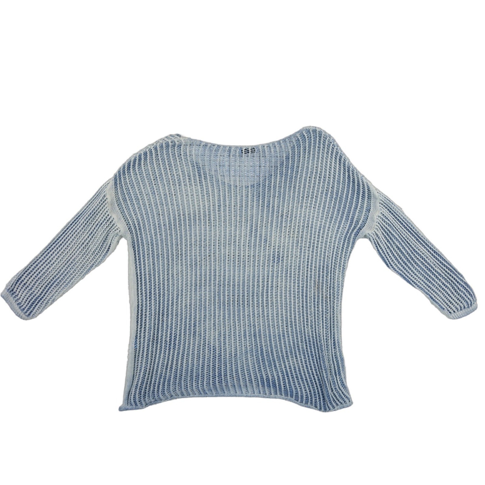 Lightweight open knit sweater crafted in Italy with a unique blue and white acid wash effect. This breezy top features a flattering V-neckline and a relaxed, oversized fit perfect for layering. The semi-sheer mesh construction provides a breathable feel, while the long sleeves and ribbed texture add a touch of effortless sophistication to a casual look.