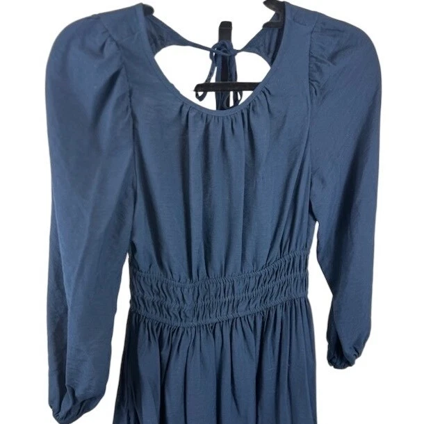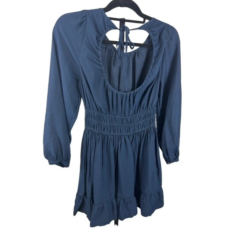 Chic mini dress in a beautiful dark blue hue. This dress features long sleeves with subtle puff shoulders, a flattering round neckline, and a smocked elastic waist that cinches the silhouette. The back boasts a trendy cutout detail with a self-tie closure, adding a touch of allure. A playful ruffle hem completes the look. Ideal for brunch with friends, a casual date night, or a relaxed weekend outing.