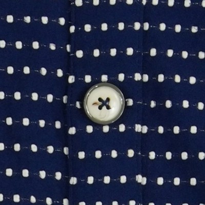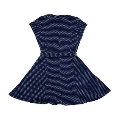 Excellent Condition! Charming fit-and-flare dress features a classic navy blue and white dotted pattern with a textured, stitched feel. Designed with a flattering square neckline and short cap sleeves, it includes a functional button-down front and a matching tie-waist belt to define the silhouette. The lightweight, stretchy fabric blend ensures a comfortable fit for all-day wear, while the full skirt adds a touch of playful movement.