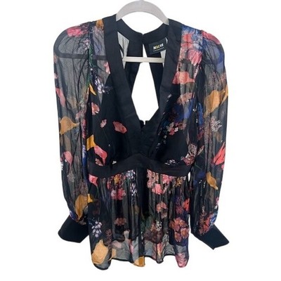 Keywords: Maeve, Anthropologie, Floral Blouse, Sheer Top, Peplum Top, Bohemian, Elegant, Long Sleeve Blouse, Floral Print, Party Top, Evening Top, Viscose Blouse, Black Trim