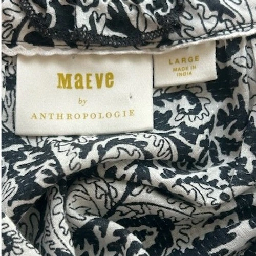 Maeve by Anthropologie maxi dress in a black and white paisley print. This sleeveless dress features a V-neckline with a ruffled collar and a tiered skirt for a flowing silhouette. Perfect for a casual day out or a vacation.