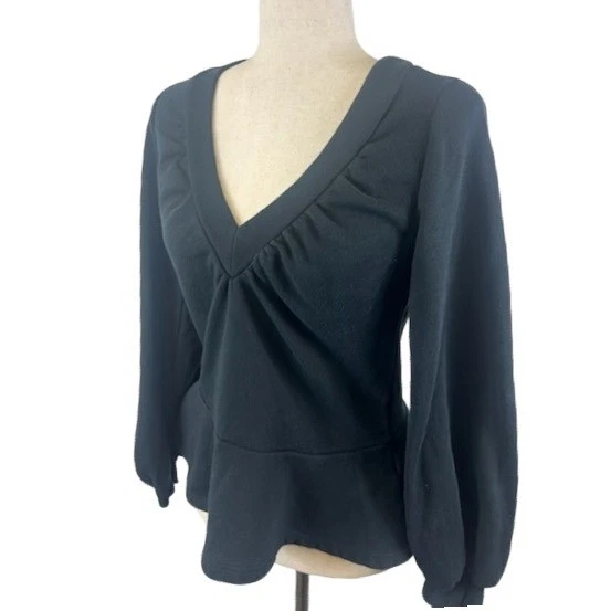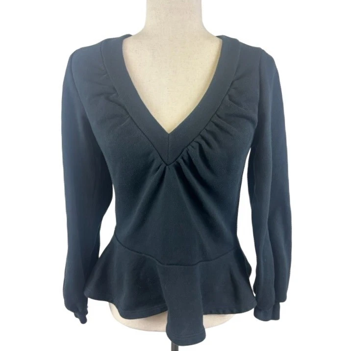 Elevated elegance defines this Maeve by Anthropologie peplum top. A sophisticated V-neckline is framed by subtle ruching, creating a flattering silhouette that accentuates the bust and draws the eye. Long sleeves offer graceful coverage, finished with a delicate cuff. The real showstopper is the charming peplum hem that flares out from the waist, adding a touch of playful femininity. This top is perfect for a polished office look, a chic dinner date, or a stylish weekend brunch.