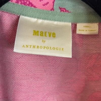 Maeve by Anthropologie cropped polo style sweater shirt in a vibrant floral print. It measures 21 inches in length. This short-sleeved top features a collared neckline with a quarter-zip closure for adjustable styling. The mint green base is adorned with bold pink floral patterns throughout. Perfect for casual outings, brunch with friends, or a fun summer day.