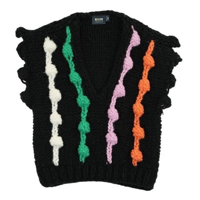 Excellent condition! Maeve by Anthropologie chunky knit sweater vest features a bold black base accented with vibrant vertical 3D bobble stripes in white, green, pink, and orange. This sleeveless V-neck top showcases a hand-knit aesthetic with playful ruffled or scalloped edges at the armholes and a classic ribbed hem. The heavy-gauge acrylic yarn provides a cozy, textured feel that is perfect for layering over long-sleeve shirts or wearing on its own during transitional weather.