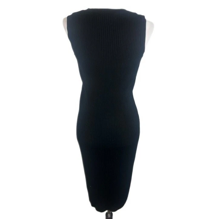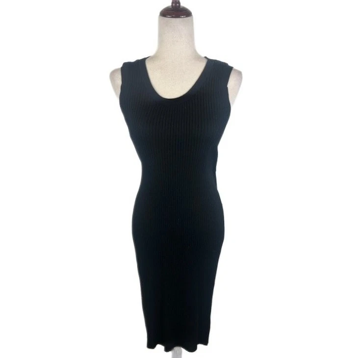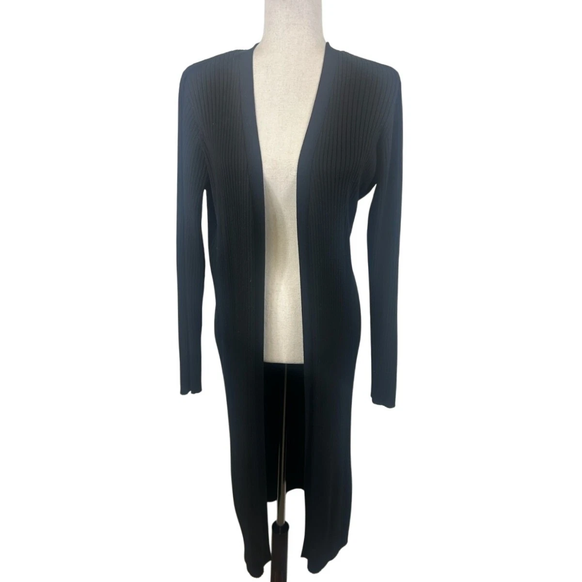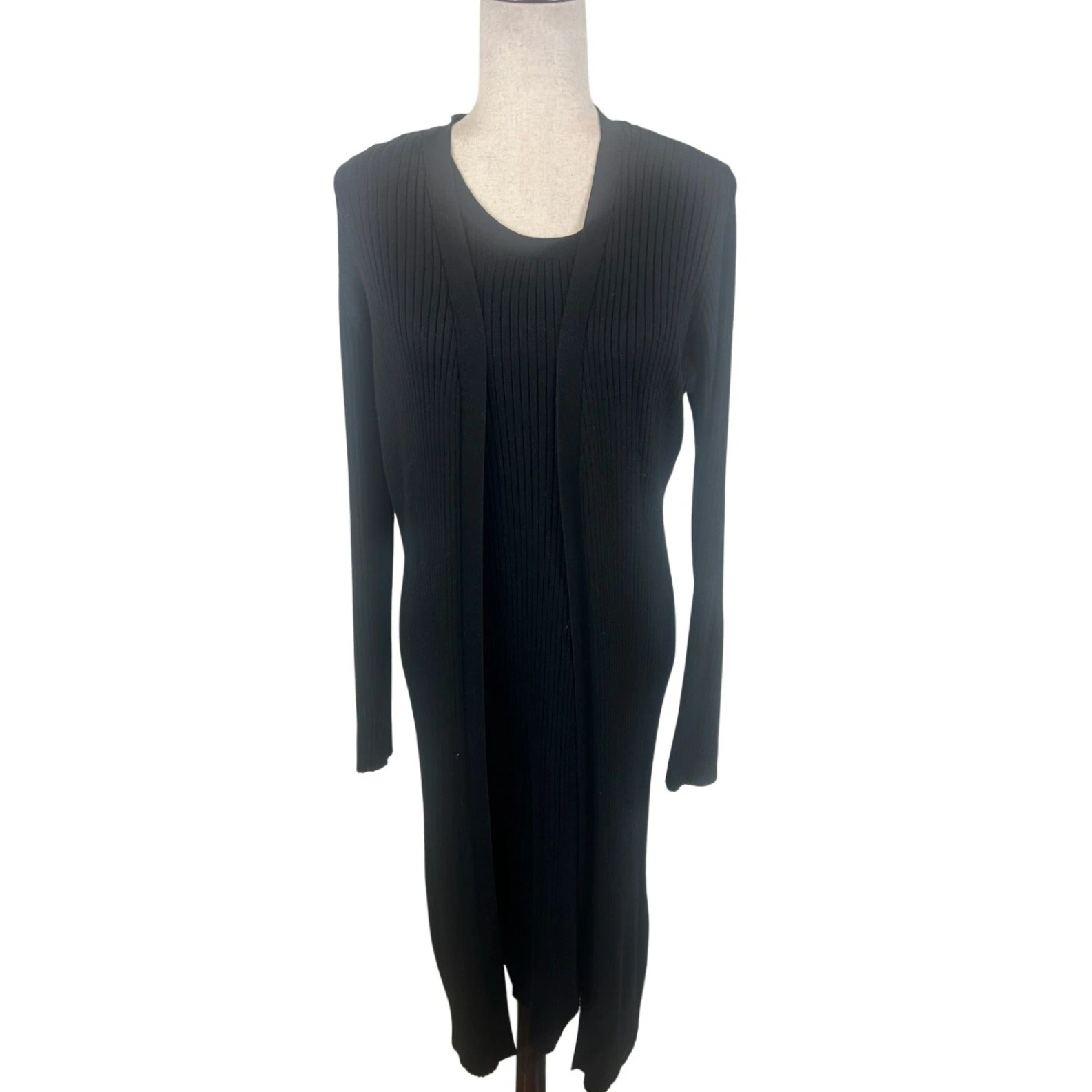 Elegant two-piece set featuring a sleeveless midi dress and a long duster cardigan. The dress has a flattering bodycon silhouette and a ribbed knit texture that adds visual interest. The open-front cardigan provides a versatile layering option, perfect for creating different looks. The sleek black color makes it a timeless choice for both casual and more dressed-up occasions. Suitable for a business casual office setting, a chic dinner date, or a stylish evening event.