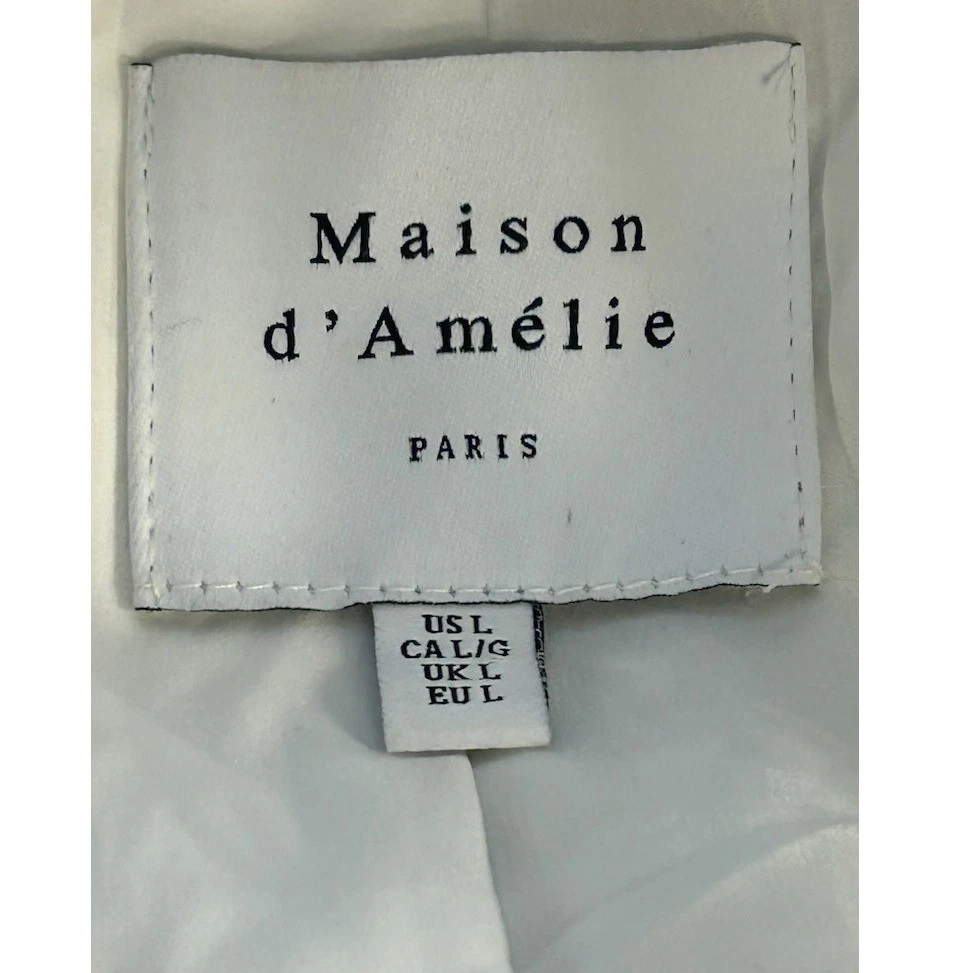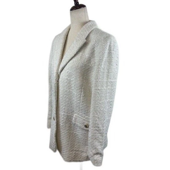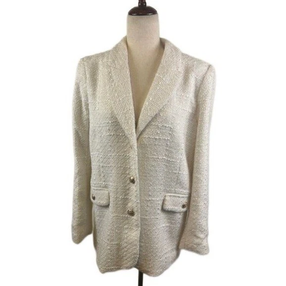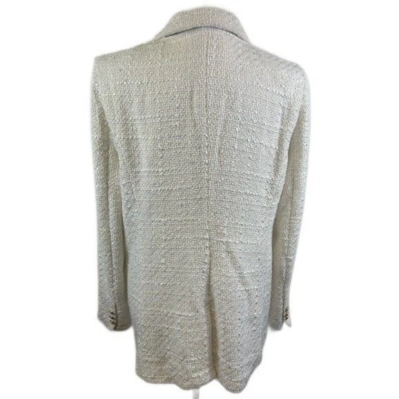 Like new! A sophisticated tweed blazer by Maison dAmelie Paris. This chic cream-colored jacket features a classic notched lapel, two front flap pockets with gold button accents, and a single-breasted two-button closure. The textured tweed fabric offers a refined look and feel. Perfect for elevating your professional attire or adding a touch of elegance to a casual outfit, this blazer is ideal for business meetings, dinner dates, or a stylish weekend brunch.