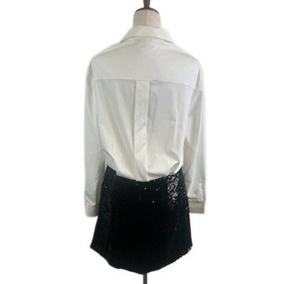 This measures 32 inches long. A striking white button-down shirt seamlessly integrated with a black sequined mini skirt. This unique piece offers a sophisticated yet playful aesthetic, perfect for making a statement. The crisp, classic silhouette of the top is beautifully contrasted by the dazzling texture and sheen of the sequined bottom. Designed for versatility, this dress is ideal for a night out or a festive occasion.