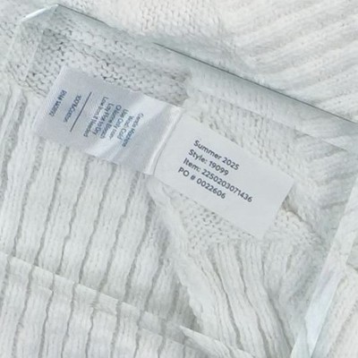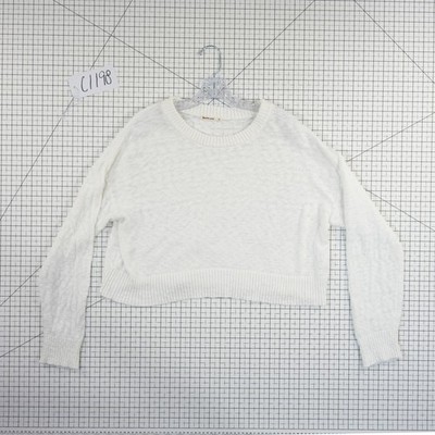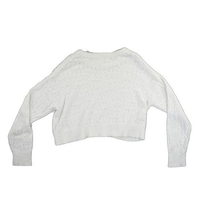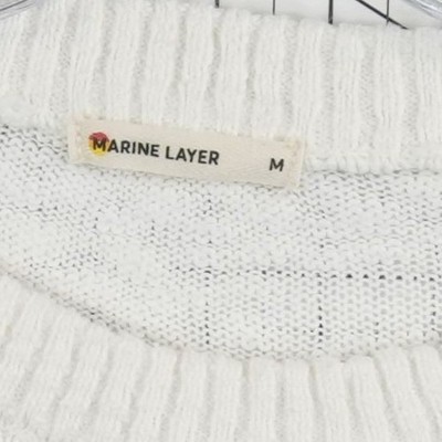 Excellent condition. Marine Layer cropped crewneck sweater in a crisp white knit. This lightweight piece features a relaxed, drop-shoulder silhouette with classic ribbed trim at the neckline, cuffs, and hem. The open-stitch texture provides a breathable feel, making it an ideal layering piece for transitional weather or cool summer evenings.