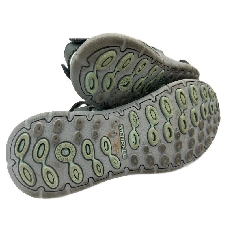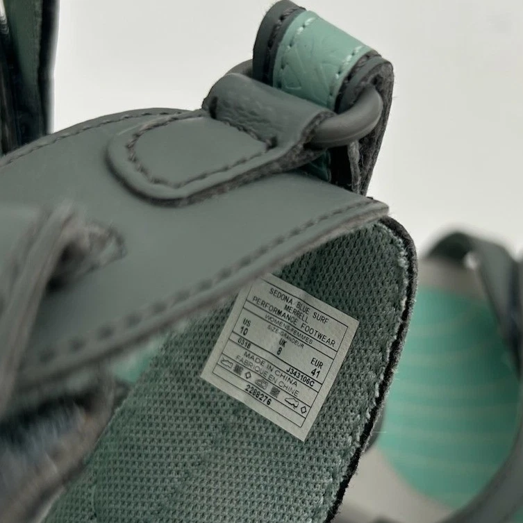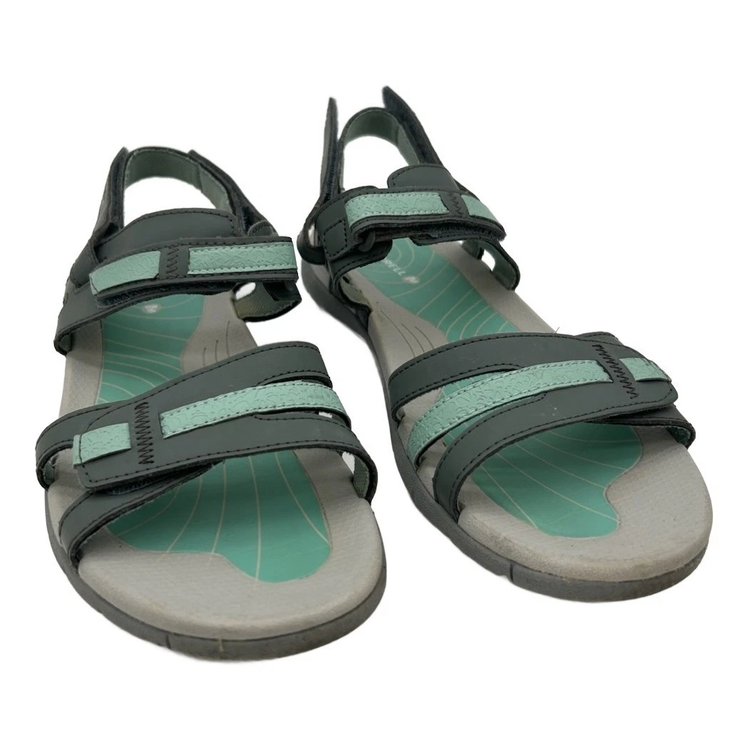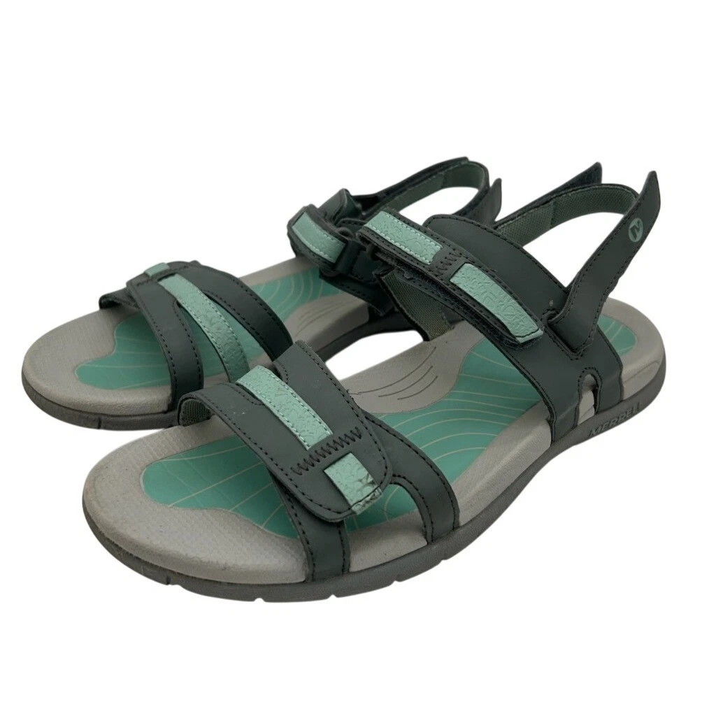 Merrell women’s outdoor comfort sandals in dark gray with teal accents. These sandals feature adjustable hook and loop straps for a secure and customizable fit, along with a contoured footbed designed for support and cushioning. The durable outsole provides reliable traction. Perfect for hiking, exploring new trails, or casual everyday wear.