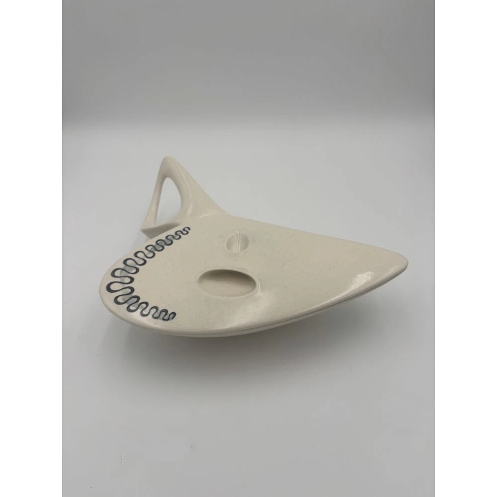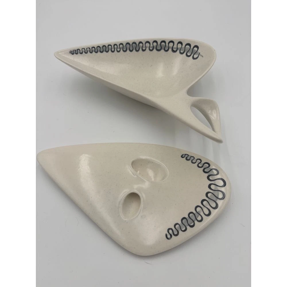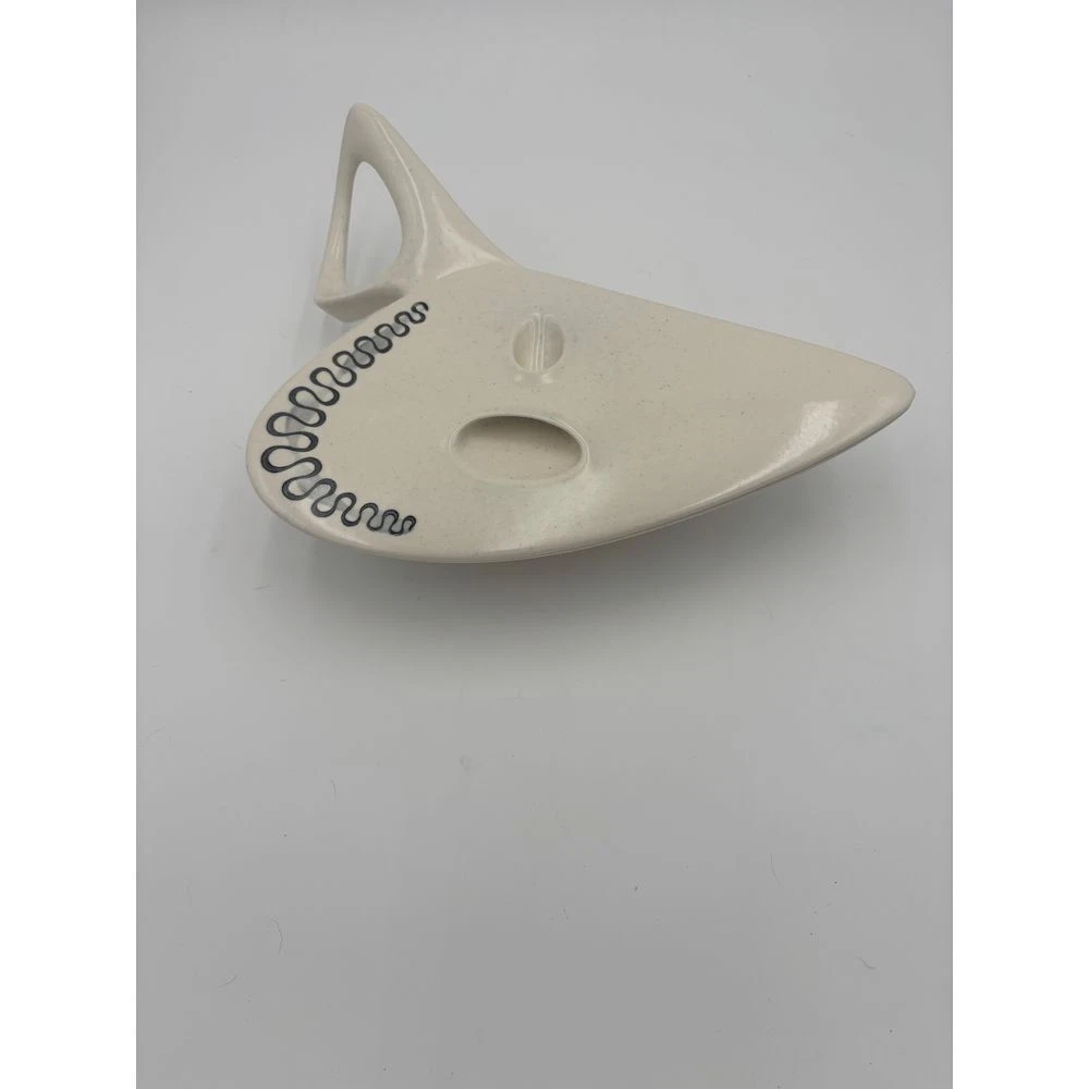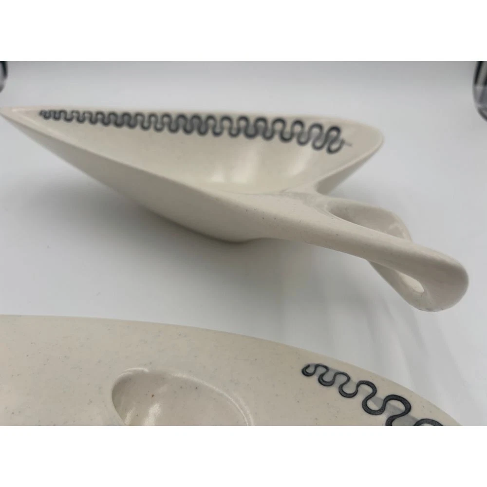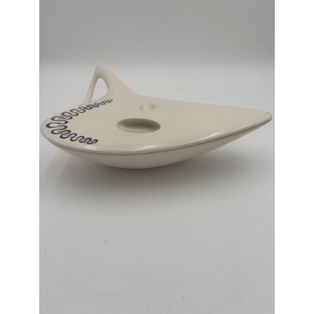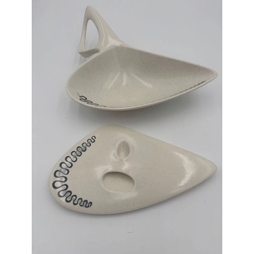 This is a rare Metlox Poppytrail Aztec Divided Lidded Boomerang Vegetable Bowl. It has a handle and the original lid, and is in pristine excellent condition. There are no stains, cracks, chips or repairs. This is very hard to find! It measures 12x11x3.58″.