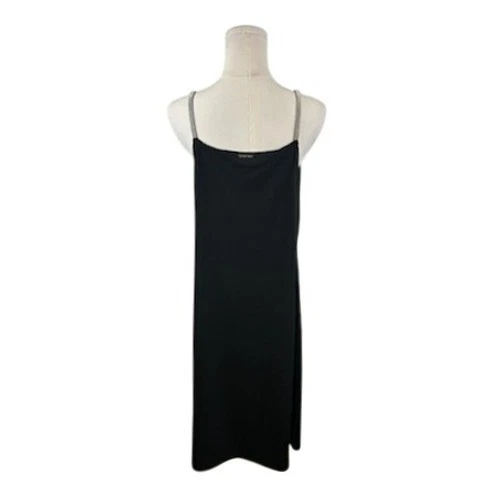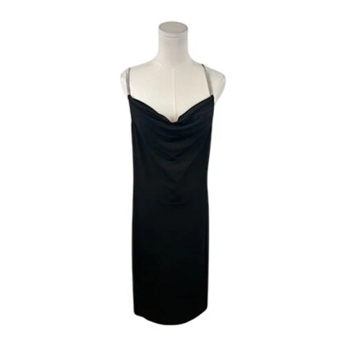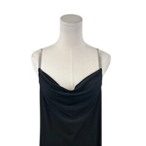New with tags! Sleek sophistication takes center stage with this stunning black midi dress. The cowl neckline drapes elegantly, creating a flattering silhouette that exudes confidence. Delicate rhinestone straps add a touch of sparkle and elevate the dress to a new level of glamour. The smooth, flowing fabric feels luxurious against the skin, ensuring comfort and style. Perfect for a cocktail party, a romantic dinner, or a special evening event, this dress is sure to turn heads and make you feel fabulous.
