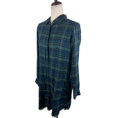 Michael Stars Plaid Button Down Shirt Dress Green Blue Frayed Hem Casual Small