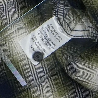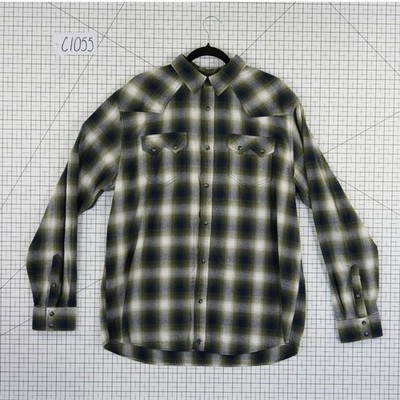 Excellent condition! Moonshine Spirits by Brad Paisley western flannel shirt features a classic olive green and cream plaid pattern with a heavy-duty twill weave. Designed with traditional cowboy styling, it includes a pointed western yoke on the front and back, pearl snap buttons, and dual sawtooth chest pockets. The interior collar is lined with a dark corduroy contrast for added comfort and durability. This long-sleeve button-down is crafted from 100% cotton, offering a rugged yet soft feel perfect for outdoor wear or casual layering.