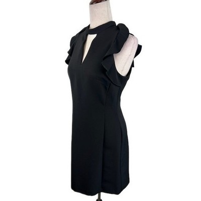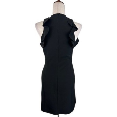 Keywords: Nadine Milano dress, black mini dress, sleeveless dress, ruffle dress, mock neck dress, keyhole dress, cocktail dress, party dress, evening dress, little black dress, contemporary dress, designer dress, italian fashion, black dress