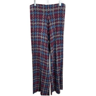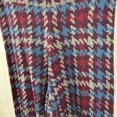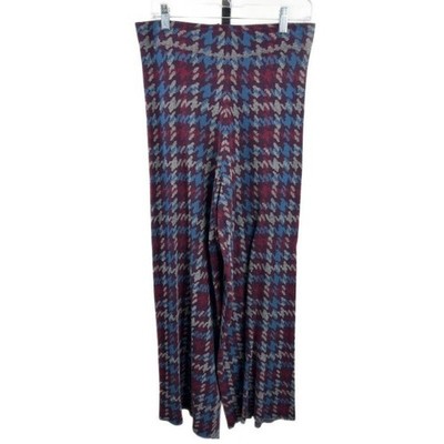Excellent condition! Natural Life knit pants featuring a classic houndstooth pattern in burgundy blue and grey. These wide-leg pants offer a comfortable and stylish option for various occasions. Perfect for a casual day out, a relaxed office environment, or a cozy evening at home.