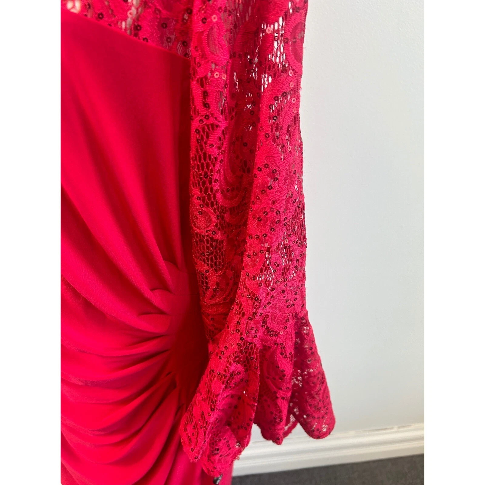 Classic yet on trend, this striking sheath dress in a soft, stretch jersey knit is designed with a dainty sheer lace yoke and three-quarter bell sleeves.
