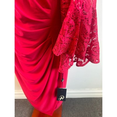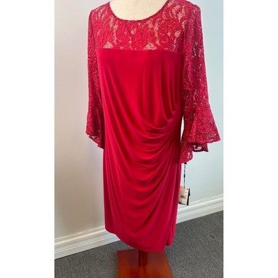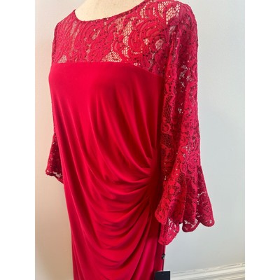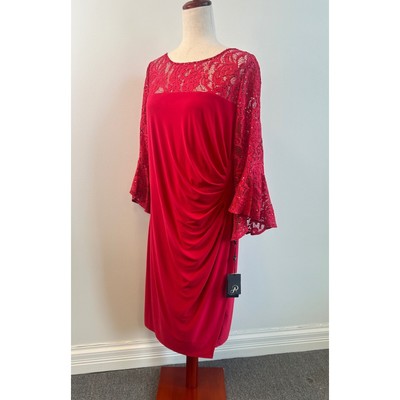 Classic yet on trend, this striking sheath dress in a soft, stretch jersey knit is designed with a dainty sheer lace yoke and three-quarter bell sleeves.