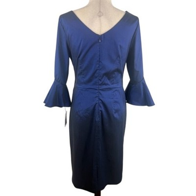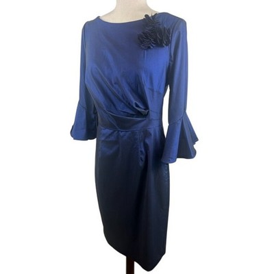 Elegant navy blue dress by Alex Evenings, perfect for any special occasion. This sheath dress features a flattering silhouette with a draped bodice and a sophisticated floral detail at the shoulder. The dress has a classic boat neckline and unique flared sleeves that add a touch of modern flair. A concealed back zipper ensures a seamless fit. This dress is suitable for weddings, cocktail parties, or a formal dinner.
