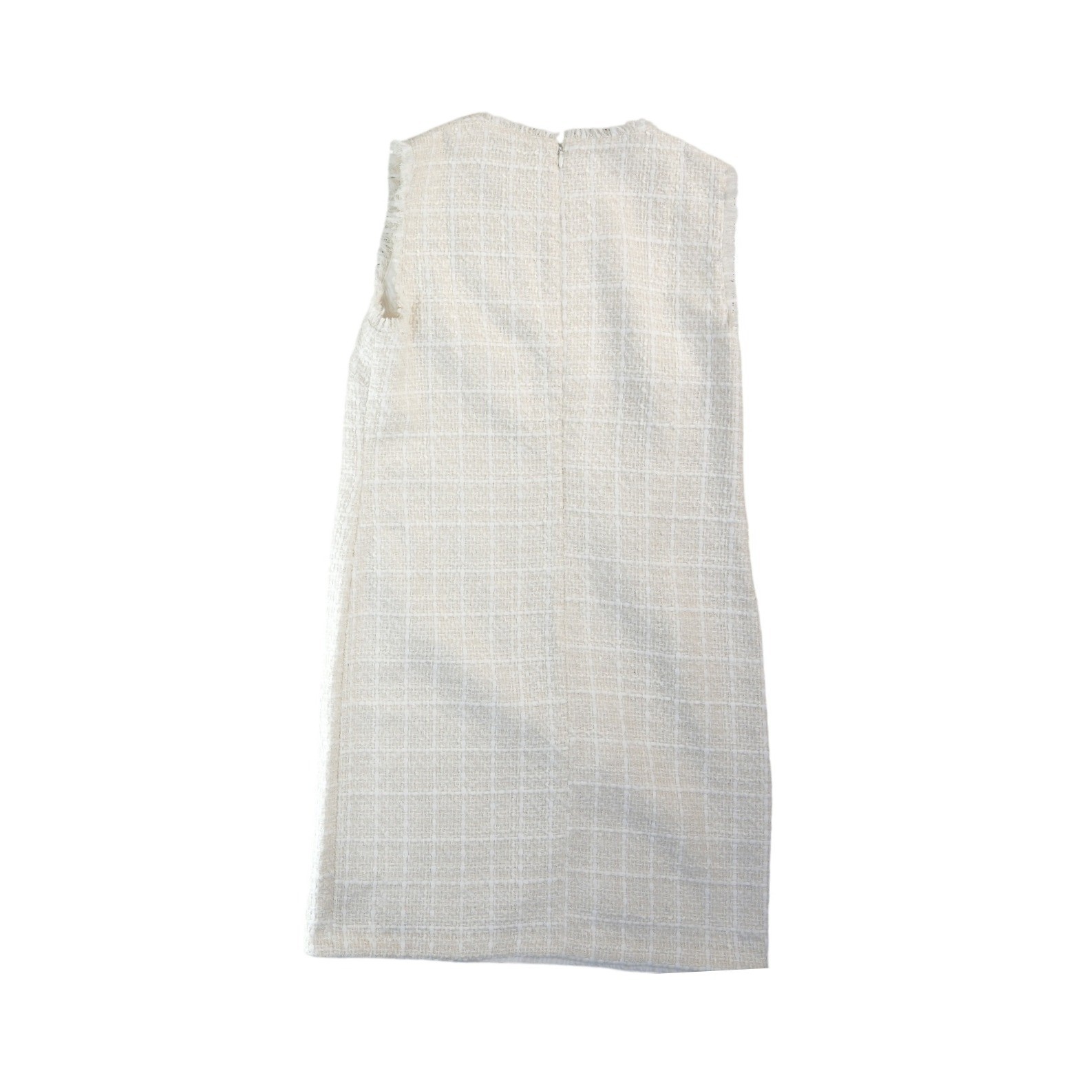 New with tags! Polished sleeveless shift dress crafted from a textured tweed fabric with a classic windowpane check pattern. This elegant piece features a sophisticated round neckline and armholes accented with delicate fringe trim, adding a touch of modern texture to a timeless silhouette. The cream and white palette offers a versatile, clean aesthetic perfect for professional settings or bridal events. Designed with a concealed back zipper for a seamless finish, it provides a structured yet comfortable fit through its fully lined interior.