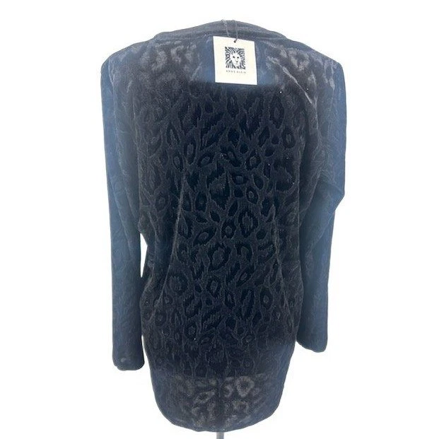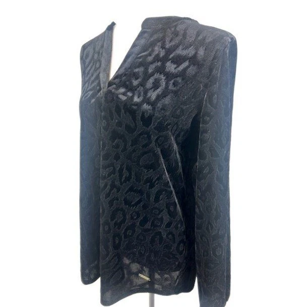 Sophisticated velvet top featuring a subtle leopard print design. This long-sleeve Anne Klein blouse features a v-neck with a chic knotted detail at the front. The soft velvet fabric provides a luxurious feel, while the all-over black leopard print adds a touch of edgy elegance. This versatile top offers a flattering, relaxed fit and is perfect for a night out, a dinner party, or a stylish office look.